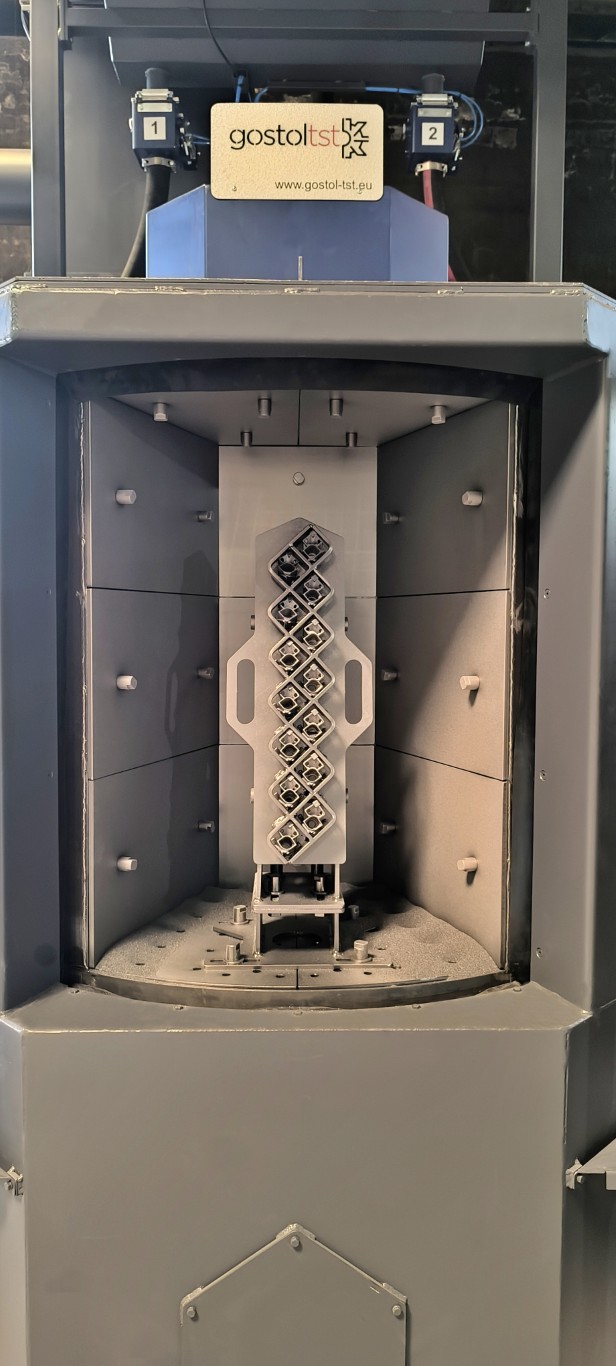Детали крепятся к специальным опорам на столе, изготовленным из износостойких материалов, что обеспечивает длительный срок службы и надежную эксплуатацию. Два отдельных отсека для обработки позволяют производить её под различными углами и с различными направлениями потоков абразива, обеспечивая тщательно контролируемую обработку поверхности.